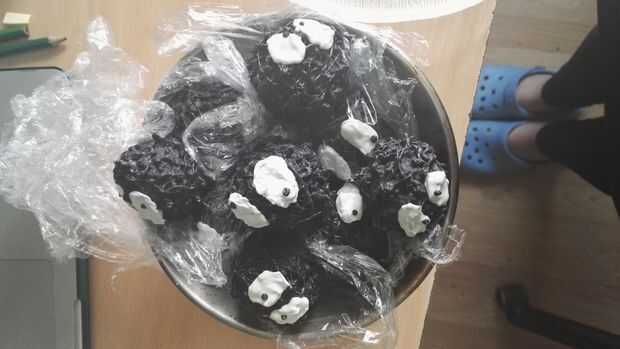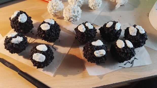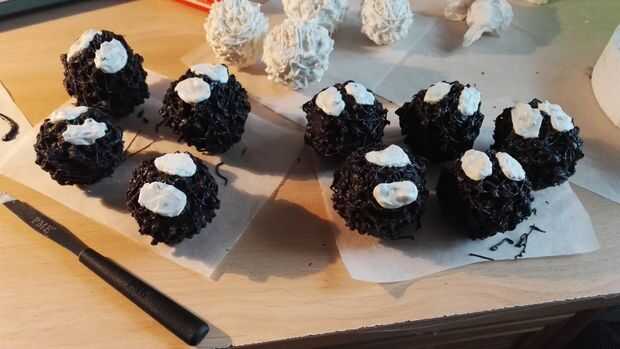 5. con más chocolate negro caramelo derretido, tubo un pequeño punto en los blancos ojos de susuwatari negro. Alumnos de susuwatari blanco, tubo algunas formas alargadas en pergamino (como pupilas de gato o un cocodrilo) y dejar que el chocolate endurezca. También hice la boca de un mal susuwatari blanco, así que siéntete libre de improvisar aquí.