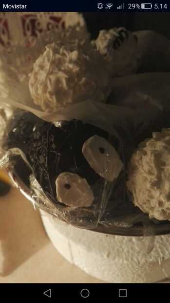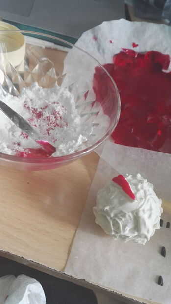 2. con la ayuda de un pincel, pintar los ojos de susuwatari blanco con esta mezcla (ver fotos) y las pupilas alargadas chocolate negro que hicimos antes sobre los ojos rojos.