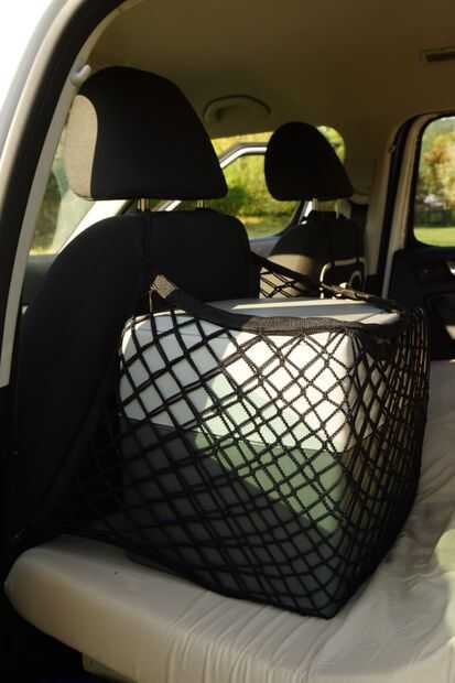 Puesto que la nevera no está integrada en la estructura tienes moverse alrededor. Durante la conducción se apoya contra la parte trasera del asiento del conductor y se asegura con una tela de araña elástica. Mientras duerme puede colocarlo en el asiento del pasajero para tener fuera del camino.