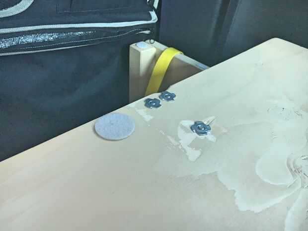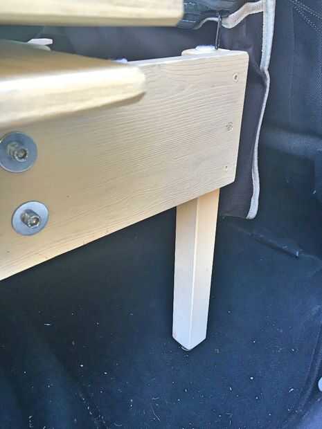 El panel delantero está montado en la misma forma que el panel central. Los soportes laterales tienen dos vigas que llegar en la sección de pie de los asientos de pasajeros y proporcionan estabilidad para la extensión para dormir. Las vigas tienen un agujero en el pie donde se apoya una tuerca en t. Un tornillo que se enrosca en la tuerca de este t actúa como un regulador de nivel.