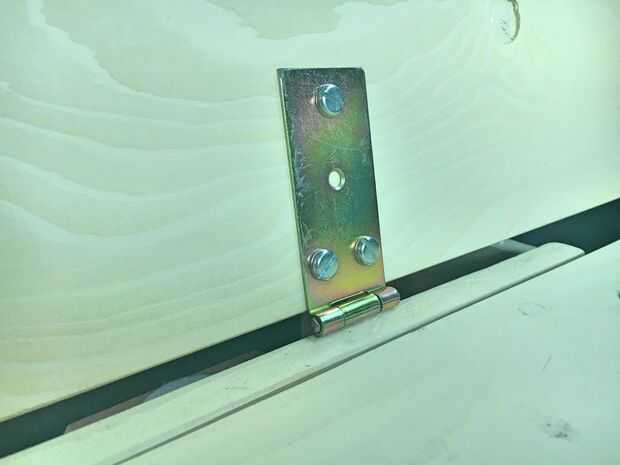 La extensión dormitorio está conectada con el apoyo de la Cruz por dos bisagras resistentes conectadas con pernos y tuercas en t. Asegúrese de que usted monte las bisagras de manera que le permite doblar la extensión dormitorio completamente nuevo y colóquelo en el panel frontal. La extensión dormitorio dispone de dos barras de madera pegados y atornillados a él para hacerlo más rígido. La sección de corte viene a descansar en el resto de conductores del brazo y le da otro punto de apoyo (que depende un poco en cómo es alto la estructura es...). Puesto que la madera es algo fina, he añadido dos soportes de estante (blanco plástico / IKEA) para hacerla más estable.