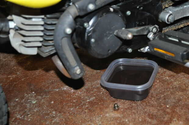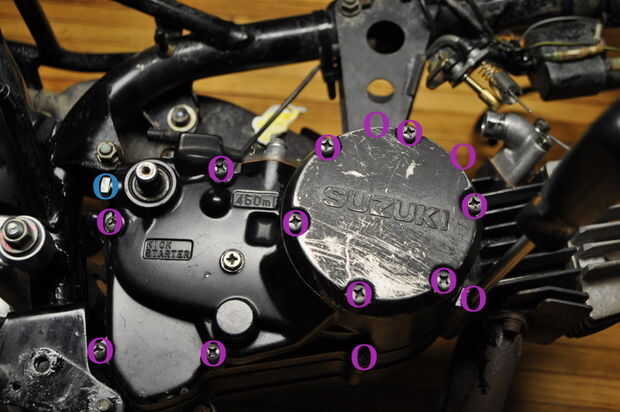 Yo he subrayado los pernos que necesitan ser removidas hay dos tornillos escondidos cerca de la cima. También hay un perno grande 17mm cerca del pedal de arranque que toma hacia fuera también. Los pernos de la tapa redonda son todos la misma longitud, el resto son de diferentes longitudes. Se puede hacer algo para tratar de mantenerlos en orden, pero hay una manera más fácil. Al montarlo, los pernos deben atenerse aproximadamente a la misma altura.