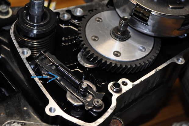 Hay un resorte en el eje de desplazamiento (flecha azul) que deben eliminarse junto con la placa. Ahora puede ver la parte que necesita pulido.