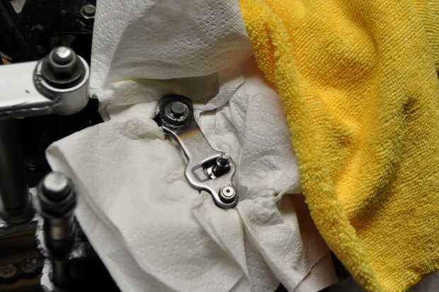 Vacío hacia fuera las virutas de retirar las toallas de papel y limpie cualquier metal de afeitar te puede ver. También puede inclinarse la moto y rociar cualquier virutas que te perdiste. Hice todo esto pero estoy seguro no a todos.