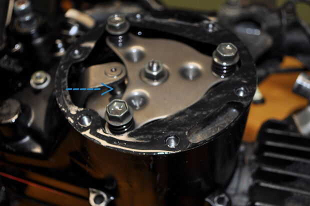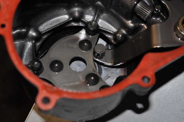 Tiempo para poner juntos. Coloque la placa y resorte y tratar de cambiar en todos los engranajes deben trabajar pero si no puede que necesite moler un poco más. Limpiar la superficie de la Junta e instale la junta nueva. Esto es una junta seca y no debe requerir ningún sellador extra. Asegúrese de que ambos pasadores en el caso de centro y no pegan en la tapa. Que parte del embrague que mantiene caída tenía una muesca en ella y debe estar alineada con la pieza en la cubierta que mantiene tirarse alrededor de la cual es porque quita la tapa redonda. Con cuidado Instale la cubierta puede necesitar un ligero golpecito pero nada más. Si usted está buscando un golpe muerto algo anda mal. Apriételo hasta olvide el perno grande kickstarter.
