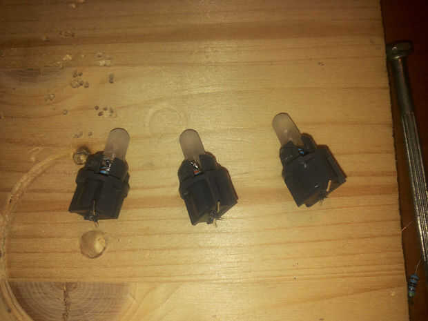 -Ahora puede insertar la led + resistencia dentro del enchufe gris para que los pines vienen hacia fuera de los orificios perforados y finalmente doblar las patas del enchufe. (si usted no tiene ningún problema falso contacto entonces solo tienes que soldar los pines en cada contactos de cobre dentro del enchufe gris, y usted está listo para ir. Antes de reconstruir todo arriba Asegúrese de que cada led se enciende, y si este no es el caso sólo girar a 180 ° el enchufe gris de la pcb: LED tienen una 'dirección', así que si les enchufa el mal manera no dañará nada, pero no iluminan bien)