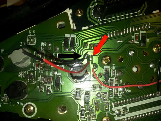 Este paso es una guía para evitar los contactos comunes entre tapones grises y los rastros del PWB, y es necesario si tienes falsos contactos al igual que yo. De ahora en adelante no puedo tomar ninguna responsabilidad por lo que está haciendo: eres modding el corazón de la corredera, así que doble Compruebe todo antes de hacer cualquier error terrible y si no estás seguro con un soldador sugieren para no seguir adelante con los siguientes pasos porque puede comprometer su tablero de instrumentos. Dicho esto, necesitamos el multímetro para tratar de entender cómo son eliminados los rastros en el pcb para evitar los contactos stock soldando los cables delgados en el primero cerca de puntos disponibles. Si usted sigue los rastros con el medidor, vas a descubrir que las 3 Bombillas están 'conectados' en paralelo, así que hay un terreno común para cada luz, así como una fuente común de 15-16V. Ahora lo que tenemos que hacer es reconocer las huellas de la tierra y los rastros de 15V.