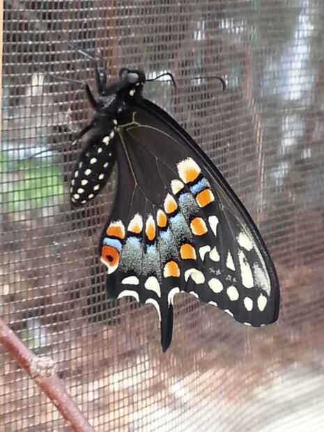 Después de otra petición a mi novio asediado, el pote de arcilla pesada con mis hierbas y planta de eneldo grande era en nuestro portal frontal con la última de las orugas de amarillo, último estadio en el remolque. Éste floreció, aparentemente viva que está etapa crisálida detrás de una librería, hasta el día que vine a encontrar esa golondrina negro aterciopelado volando en mi pórche de entrada.