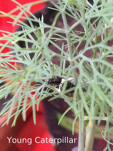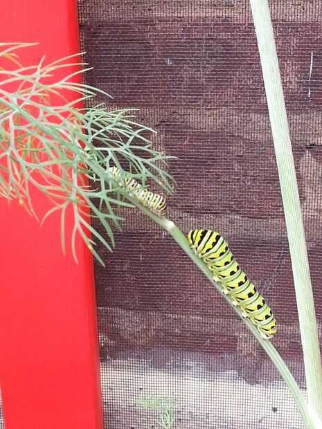 Mantener un ojo hacia fuera para mariposa huevos (en la primera foto) en sus plantas de eneldo. Cuando nacen, serán bichos marrones poco pequeños con un centro blanco y finalmente obtendrá un poco más oscuros a medida que crecen (segunda foto). Mover la planta en su nueva jaula, mantener la planta regada y ver las orugas crecen. Después de una o dos semanas, serán cerca de dos pulgadas de largo (tercera imagen). Estos chicos caca mucho cuando son de este tamaño - así la razón de la trampilla facilitar la limpieza.
