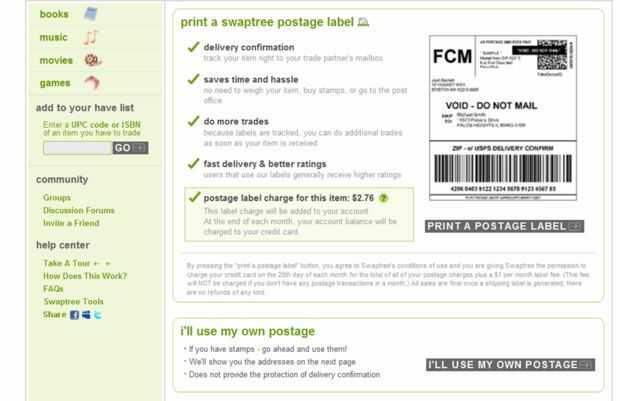 Si su comercio se completa, usted tendrá la opción de utilizar franqueo de swaptree, o usando su propia. Con swaptree, no tienes que ir a la oficina de correos, otros usuarios pueden rastrear tu artículo y generalmente llega más rápido. Si utiliza su propio franqueo, no tienes que dar swaptree su número de tarjeta de crédito, y el costo es generalmente más bajo. Siempre he utilizado mi propio franqueo.