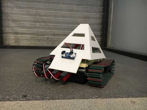 Nosotros también 3D impreso forma de tetraedro para servir como tapa para el tanque. Esto nos permitió poner el detector de infrarrojos en la parte frontal del tanque para ser capaces de detectar la distancia de los coches delante de nosotros para que pudiéramos evitar colisiones. Ponemos los seguidores de la línea de tres por debajo de la campana de la cubierta del tetraedro. Por último, utilizamos la apertura en la parte posterior para poder conectar y desconectar la batería de 9V como sea necesario.