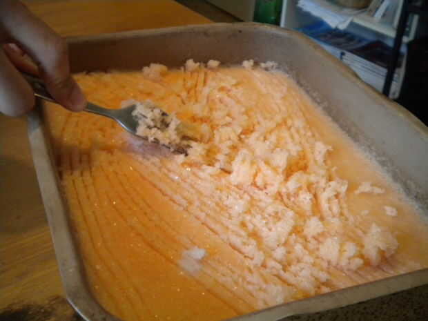 La raspadura de día siguiente en el granizado con un tenedor rayar la mezcla en pequeños cristales.