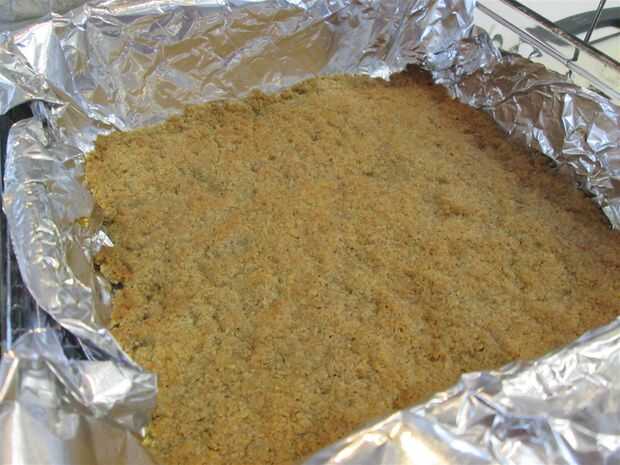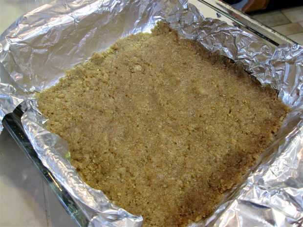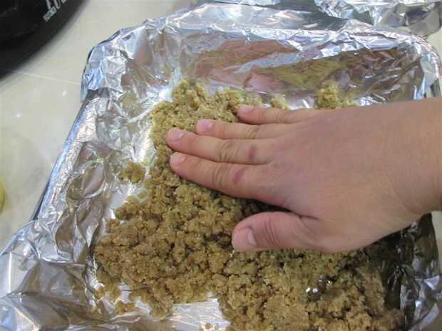Coloque la mezcla de la corteza en la parte inferior de la cacerola (o bandejas) y extensión alrededor.
