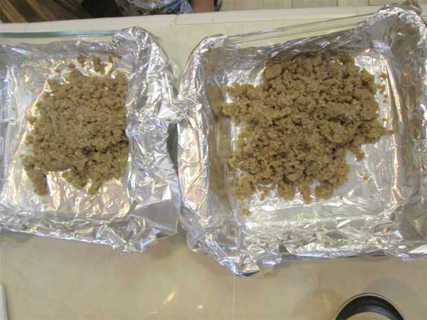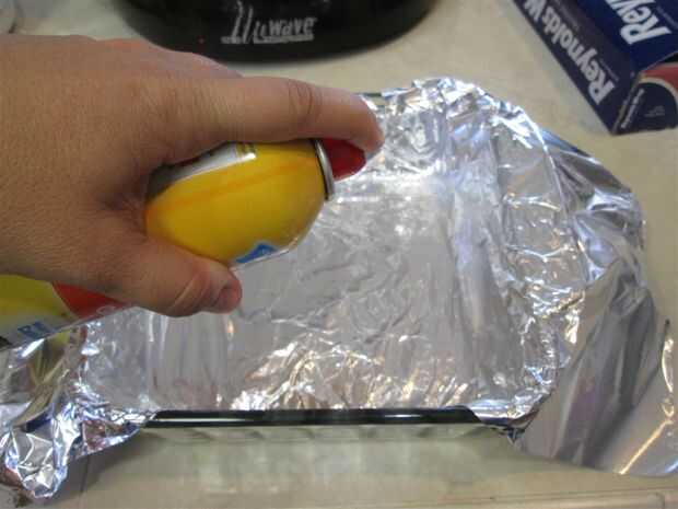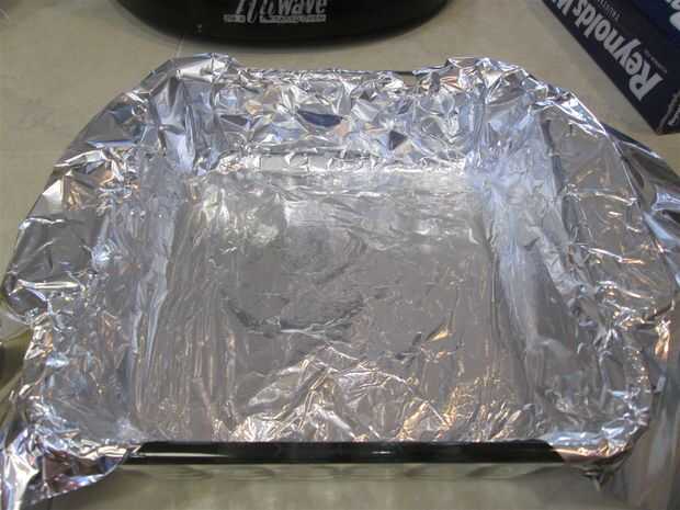 Línea de la bandeja de 13 x 9 o los recipientes de dos 8 x 8 con papel de aluminio, por lo que hay proyección a ambos lados de la bandeja para facilitar la extracción.