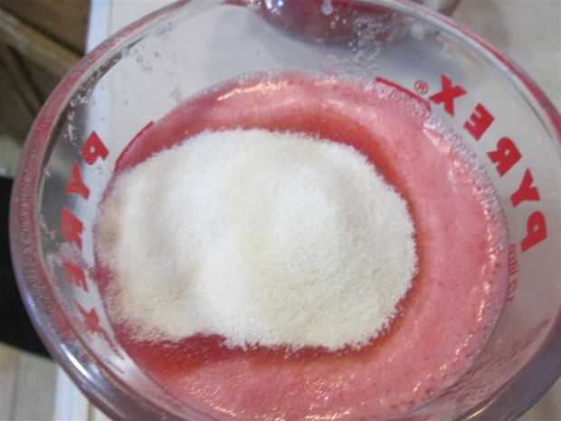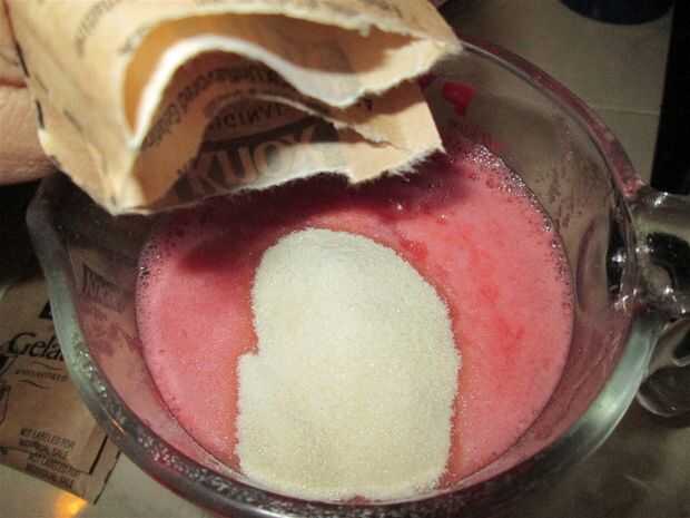 Espolvorea el 1 oz de gelatina (en mi caso, todos los cuatro paquetes) por encima de las 2 tazas de jugo de sandía y dejar reposar 2 minutos.