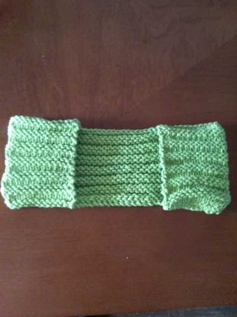 Garantizar la última puntada, pero no cortar nada todavía. Agarra por un pie o tan del hilado de la bola de trabajo, cortar allí y enhebrar un hilo con esta cola. Voltee su sección 14 la puntada de la sección 42 puntadas y emparejar los bordes y esquinas. Luego tomar su aguja del hilado y la cola de su hilo para coser las dos capas junto con y por todo lo alto o puntada de manta a través y alrededor de la esquina, creando un bolsillo. Lo amarra y tejer al final.