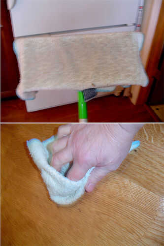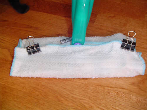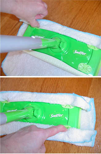 que había visto unos Swiffer instructables aquí y pensaba qué gran idea eran - comprar las botellas de solución y los cojines era costosa y derrochadora, y las almohadillas húmedas dejan un residuo en el piso. Tengo todo lo necesario, pero no tenía tiempo para hacer los cojines lavables o mod la botella wetjet para que sea recargable, por lo que se me ocurrió una manera rápida y perezosa para obtener los mismos resultados.