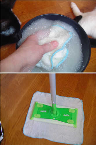 Todo lo que necesitas es un Swiffer, un cubo, algunos paños viejos y la solución de limpieza.