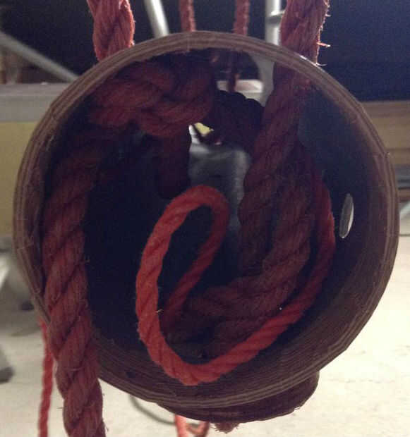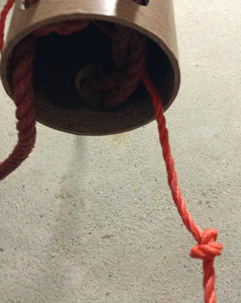 Paso final es hacer un nudo fijo en uno de los agujeros. El otro extremo se utiliza para lanzar sobre la rama. También ate la cuerda más delgada en los agujeros que ha perforado. Asegúrese de que un extremo de la cuerda es corta y el otro un poco más largo para swing es fácil de tirar de la cuerda antes. Lazo en el lado largo un nudo ajustado a tus preferencias.