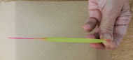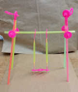Ahora, coge la paja de 4" y estos Strawbees. Empuje un Strawbee en el extremo del paso importante si desea que el swing para ser recto. Pellizcar el extremo de no Strawbee de la plana de paja para que coincida con el extremo de Strawbee como se muestra. Esto hará más fácil alinear la Strawbee cuando usted empuja en el otro extremo. El empuje del Strawbee para hacer la "swingy" parte de la su Strawbee doble hará que el asiento del columpio. Montar estas piezas como esta.