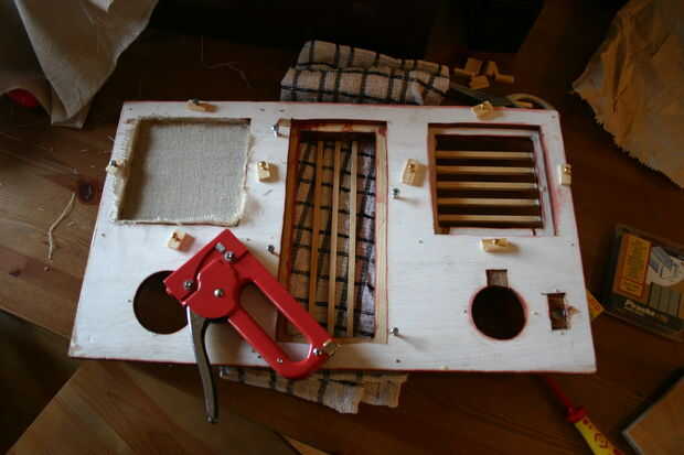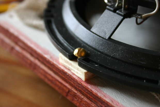 El paño de altavoz del hessian fue con grapas en su lugar. Salí de un borde de 1cm alrededor de la parte posterior de los agujeros del altavoz, entre las diferentes piezas de capa para cubrir la unión entre la tela y madera. Engrape la tela en los lados opuestos del agujero alternativamente, asegurándose de que usted tire agradable y apretado para obtener la tela tensa. Se puede ver que grapar paralelo al frente, no en la parte delantera para una grapa no pop a través de y arruinar el acabado. Entonces fue recortar la tela y los altavoces atornillan en su lugar. Nuevamente, tenga cuidado de no perforar o atornillar a través al frente del estéreo.