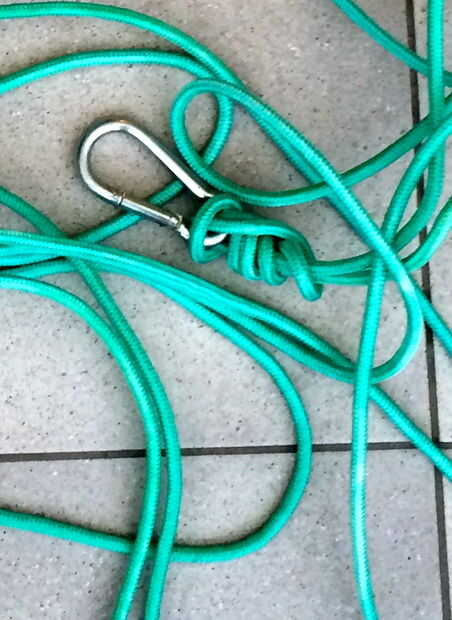 Añadir un peso en el otro extremo de la cuerda. He utilizado un gancho de la carabina. Esto le dará la cuerda una manera de bajar cuando está lanzado sobre una rama.