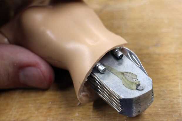 Para ello he encontrado zonas alrededor de la manija del cuchillo que tienen huecos lo suficientemente grandes como para poner pequeños imanes, luego ajustaron un imán con el fondo al ras con la línea de Barbie bisecan.