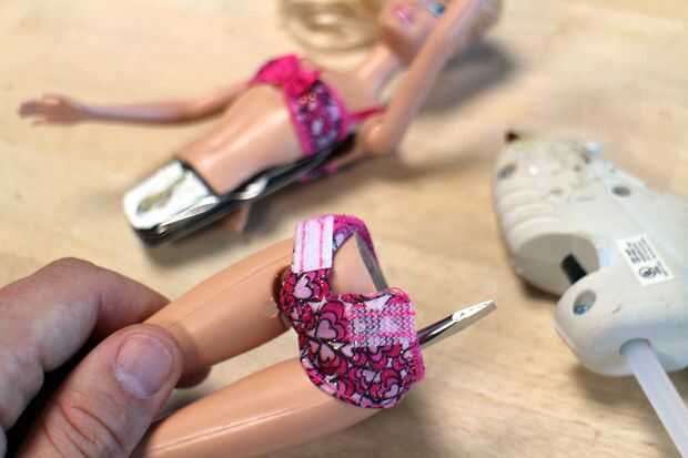 El siguiente es hacer ropa de Barbie en. He utilizado pegamento caliente para fijar la parte superior de su bikini en su lugar, luego se corta una parte del lado a acceder a las hojas, pegar las solapas abiertas a los lados de la muñeca.