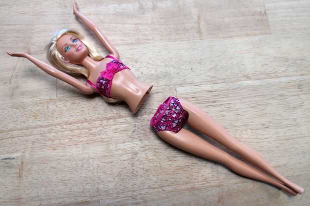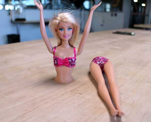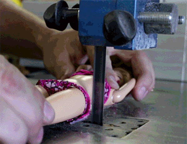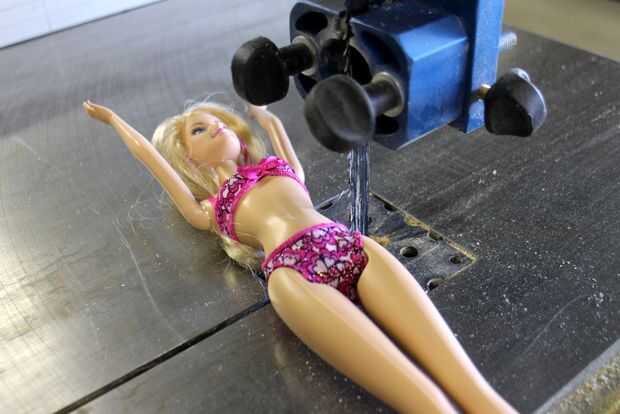 Para llegar a las entrañas de Barbie tendremos que atraviesan su cuerpo plástico. Yo cuidadosamente aserradas a Barbie por la mitad en su cintura.