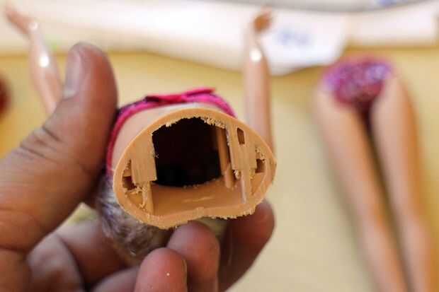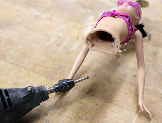 Hay alguna estructura de soporte dentro de Barbie para alinear las dos mitades de su cuerpo cuando ella fue fabricada, este plástico extra tendrá que cambiarse con el fin de encajar el cuchillo plegable dentro de su torso.