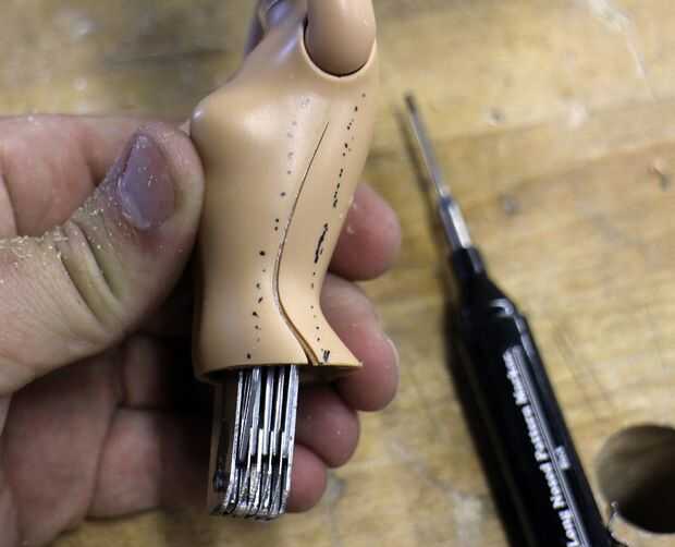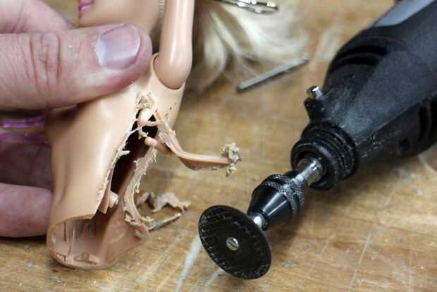 He bosquejado líneas de corte en un lado del torso de Barbie y luego utilizar un disco de corte en la herramienta rotatoria para crear una abertura. Los bordes estaban limpios con un cuchillo afilado.
