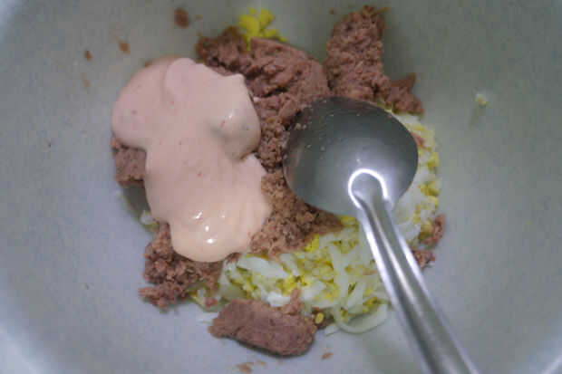Paso 4: El relleno: en un boll agregar el atún, los huevos rallados y 2 cuchara de la salsa