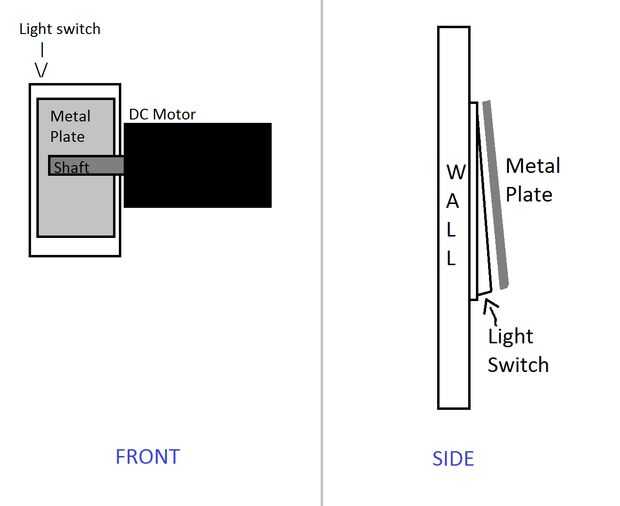 Una vez que la chapa se pega al eje, use la pistola de pegamento para pegar el motor a la pared, texto para el interruptor de la luz. Se puede ver cómo mina había pegada a la pared en el video al principio y en el diagrama anterior.