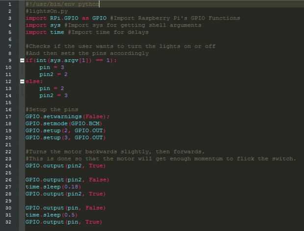 <p>#!/usr/bin/env python<br>#lightsOn.py import RPi.GPIO as GPIO #Import Raspberry Pi's GPIO Functions import sys #Import sys for getting shell arguments import time #Import time for delays</p><p>#Checks if the user wants to turn the lights on or off #And then sets the pins accordingly if(int(sys.argv[1]) == 1): pin = 3 pin2 = 2 else: pin = 2 pin2 = 3</p><p>#Setup the pins GPIO.setwarnings(False); GPIO.setmode(GPIO.BCM) GPIO.setup(2, GPIO.OUT) GPIO.setup(3, GPIO.OUT)</p><p>#Turns the motor backwards slightly, then forwards. #This is done so that the motor will get enough momentum to flick the switch. GPIO.output(pin2, True)</p><p>GPIO.output(pin2, False) time.sleep(0.18) GPIO.output(pin2, True)</p><p>GPIO.output(pin, False) time.sleep(0.5) GPIO.output(pin, True)</p>