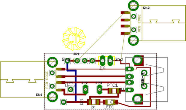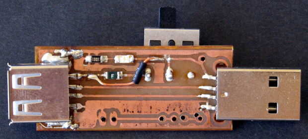 El siguiente examen fue diseñar el dispositivo para fácil grabado en una sola tarjeta echada a un lado. Esto requiere piezas de SMT para el conector USB y el receptáculo.