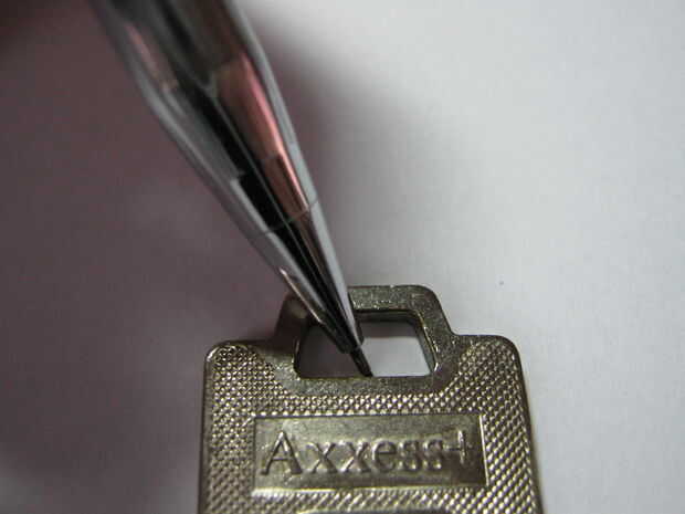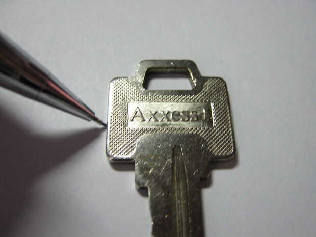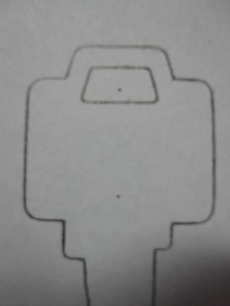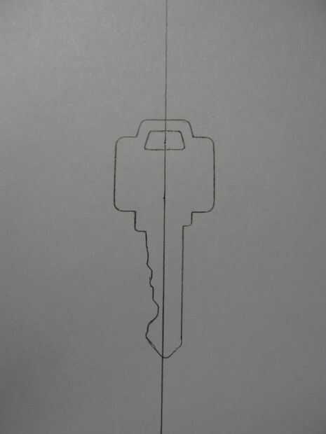 Puse un trozo de cinta en la parte posterior de mi llave de la casa y colocarlo sobre un trozo de papel de impresión regular. Entonces remonta una copia en una hoja papel de impresora, asegurando que era tan preciso como podría ser. Con una regla me marca dos puntos que estaban en medio de la llave de la casa calcada. Utilizando los dos puntos creados dibujé una línea vertical por el medio de la llave de la casa calcada. Esta línea vertical se utilizó como punto de partida en mis planos y se cercioró de que todo estaba alineado.