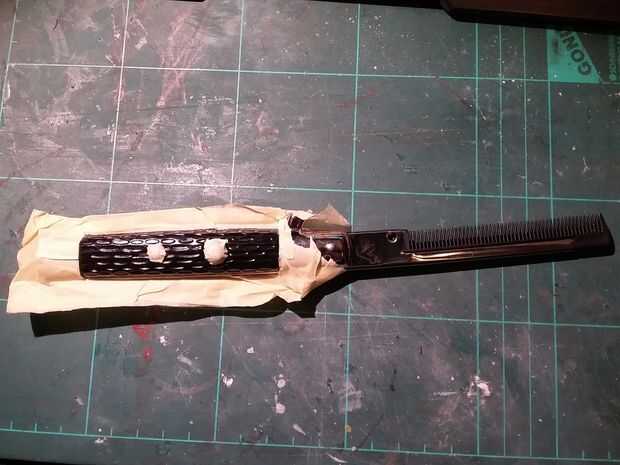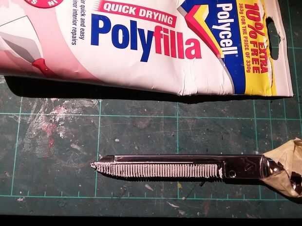 Decidí que una parte lisa en los puños, como el cuchillo se describe como ser "único". Usted puede hacer esto, pero es totalmente opcional. Lo principal es llenar las ranuras del peine con Polyfilla. De hecho, si usted quiere puede dejar solo totalmente los puños - recomiendo editarlas sin embargo, para cambiar de plástico barato acabado.