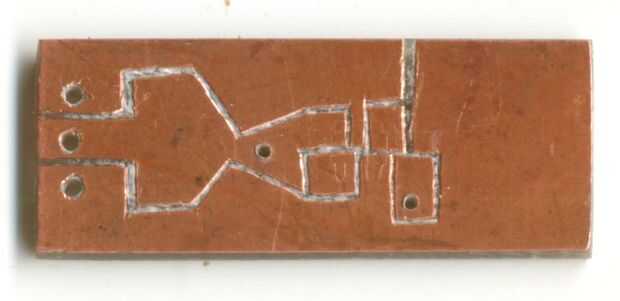 Un pequeño trozo de placa de circuito, alrededor de la anchura de un 7805, pero más largo, fue cortado del tablero revestido cobre echó a un lado doble, los patrones para aislar almohadillas de corte con un cuchillo afilado y los agujeros perforados para conexiones al plano de tierra en el otro lado.