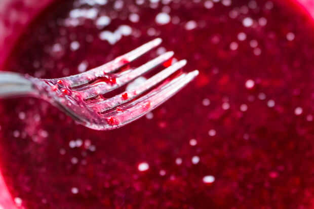 La capa superior es a la vez simple y complejo. Es una combinación simple, pero es algo difícil de conseguir la consistencia correcta. Mi objetivo era hacer no goteo como la mermelada, pero no gomosa. Básicamente, debe sentirse como comer mermelada con la comodidad de que no rezuma por todas partes mientras que usted come. La relación en mi caso fue alrededor de 10 a 1 mermelada a la gelatina, aunque fue en el lado gomoso, así que un poco menos habría sido aún mejor.