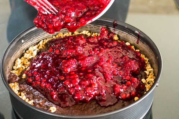 Como la tarta era genial, sacó del atasco con ya gelatina fundida, se mezcla un poco por si acaso y se vierte algunos arándanos congelados allí. Sugiero les descongelar antes de esto pero ya que enfríe la mermelada rápidamente y gomoso para arriba o al menos ser más difícil de verter sobre la tarta.