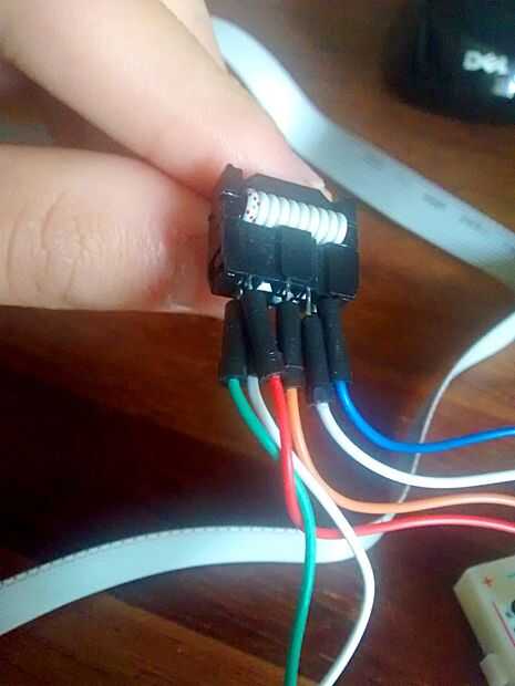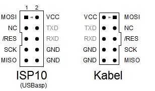 Luego conectar el programador al ordenador y los pernos en su lugar adecuado en la placa perforada. (manchas negras a la izquierda para el atmega, nombres están en azul a la izquierda en la foto). Tomar atención al hacerlo, si se conecta al revés, puede destruir el atmega32!