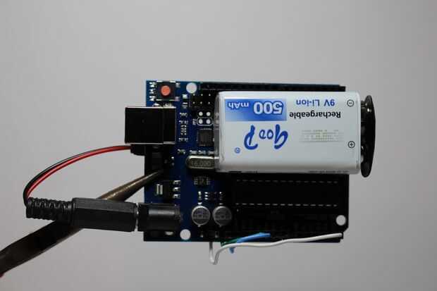 En este paso, incluir la batería de 9V dentro de la Junta de desarrollo mediante la adición de una capa de cinta aisladora o cinta de doble cara. Asegúrese de que la batería no toque directamente la Junta. Usé el cable de alimentación de 9v para conectar la batería al arduino. Si desea utilizar el cable de usb, puede saltarse este paso y pasar a la siguiente.