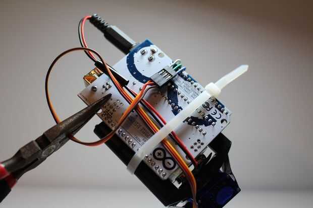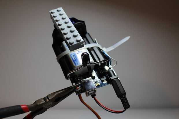 Por último, añadir la plataforma de montaje del teléfono en la parte superior del dispositivo y la correa hacia abajo usando un lazo de cable. En cuanto a la gestión de cables, los cables pueden ser perfectamente escondidos, detrás de la placa arduino.