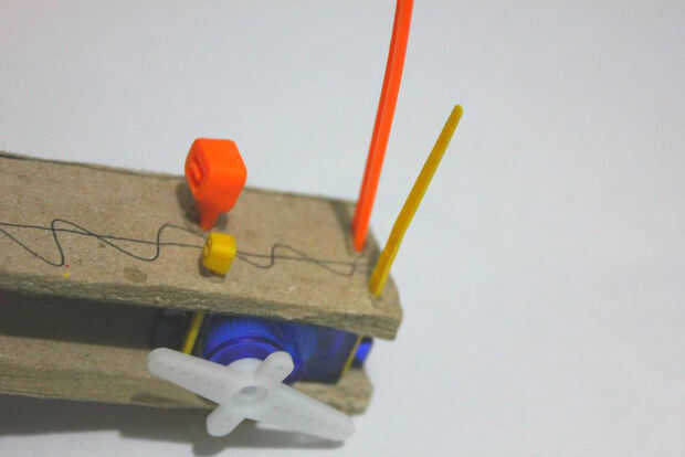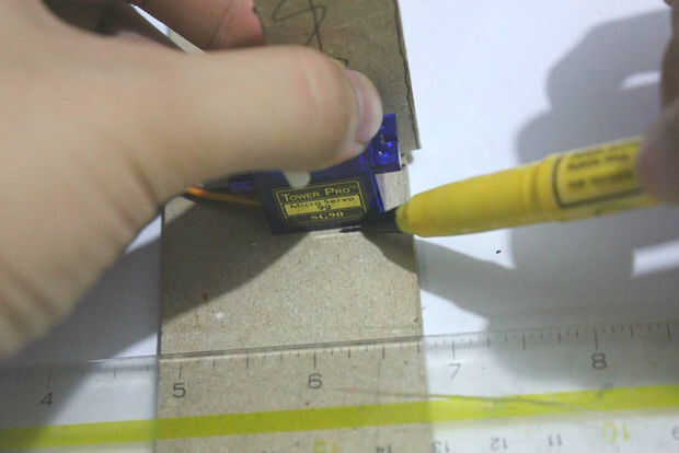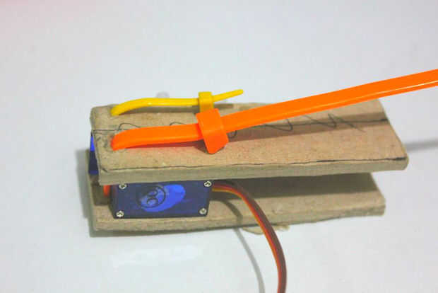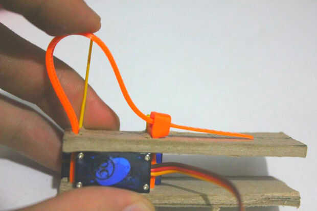 Para colocar el servomotor en lugar con estabilidad y pulcritud he utilizado bridas. ataduras de cables pueden ajustarse más tarde. El cartón debe ser estable y sólida con el motor servo entre las juntas de 2 papel ya que esto crea vibraciones y movimiento y se pueden menear.