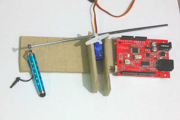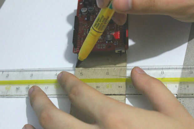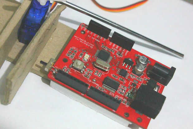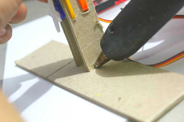 a medir la cantidad correcta para caber el arduino, el soporte para el servo y un espacio para el teléfono. Entonces sólo pegamento pistola el soporte a la Junta para que sea estable. Colocar una cantidad generosa para mantener en su lugar ya que el servomotor puede crear mucho movimiento.