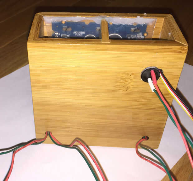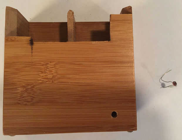 Para dar su aparato algunos comentarios y la conciencia, preparan el detector de luz y zumbador para soldar alambre de conexión tiempo suficiente para llegar a la parte posterior del soporte. Perfore un agujero en la parte delantera apenas grande bastante para el detector de luz. Corte un agujero más grande en la parte posterior para el zumbador. Como con los otros pasos, los componentes, ejecute los cables en la parte posterior y pegar con el pegamento de silicona.