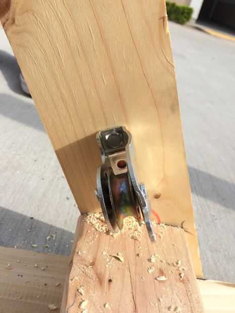 Paso 2: Perno de dos poleas una pieza diagonal de madera que va encima del brazo del tanque de inodoro. (Imagen #3)