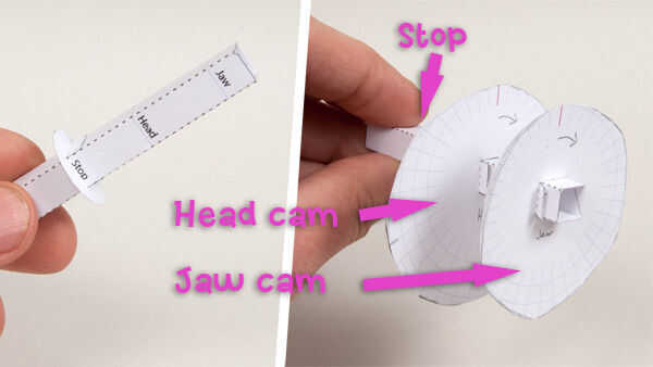 La leva principal del hilo de rosca en su posición en el eje. Si están experimentando con perfiles de leva, no pegarlos en todavía. La leva de la mandíbula inferior en el eje del hilo de rosca. Asegúrese de que la línea de lectura en tanto se alinean para que las partes estén en sincronía con los demás.