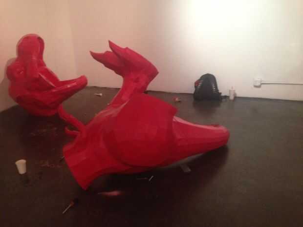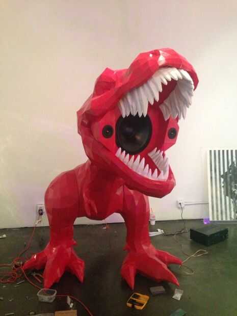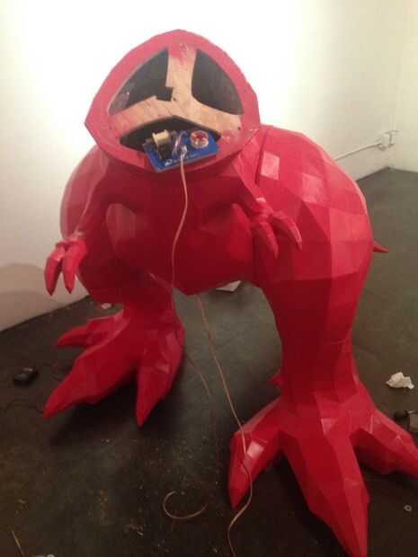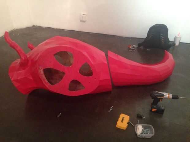 cada pieza está apretado con carro de 3 "x 1/4 pernos con tuercas de mariposa. Asamblea va Torso -> cola -> rodilla izquierda -> pie -> rodilla derecha - > derecha pie - > levantar stand -> cable de la cruce -> Monte la cabeza -> Monte las speakiers -> caliente pegue los dientes.