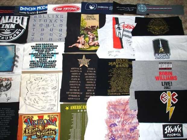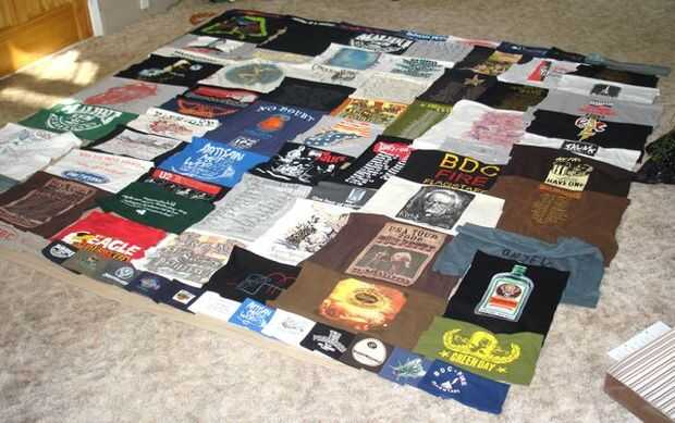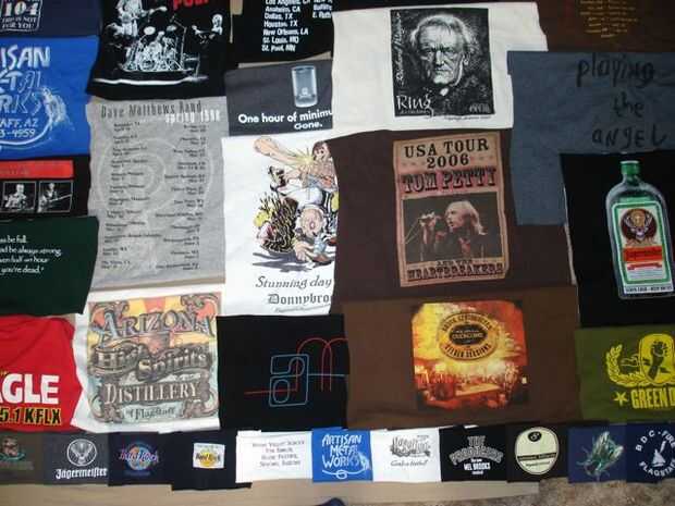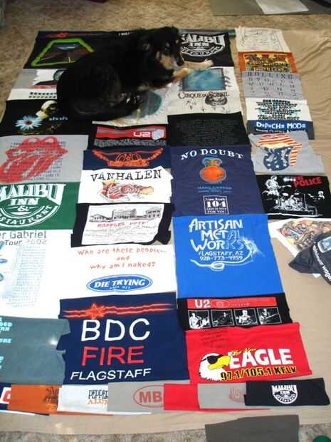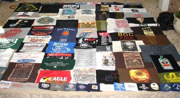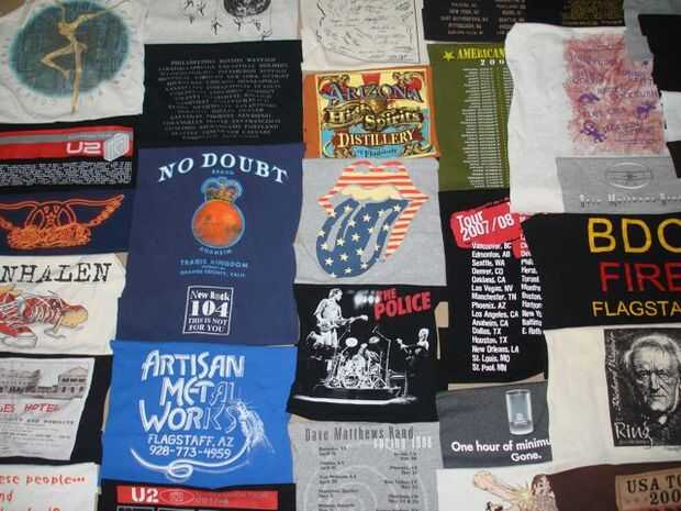 El tejido más grande siguiente consistió en más de 70 camisetas y 20 impresiones de bolsillo. Esta colcha fue hecha para que un amigo acomodar sobre todo su concierto y música camisetas de los años. Este fue mi diseño más difícil hasta la fecha! Las dimensiones finales fueron aproximadamente un tamaño estándar de la reina y fue construido utilizando franjas verticales.